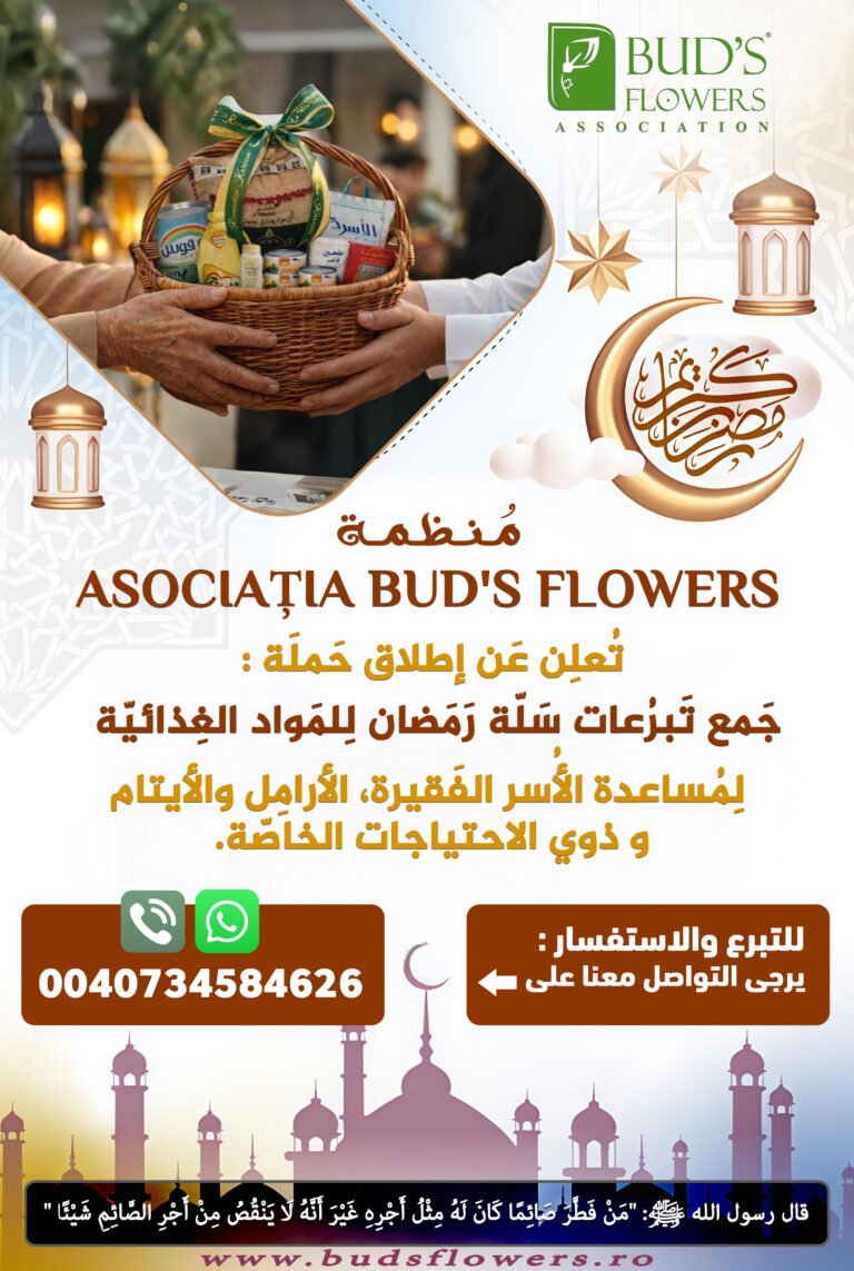 ها نحن نقترب من أيام الخير والرحمة، من شهر تتضاعف فيه الحسنات وتفرح فيه القلوب. ومع حلول شهر رمضان المبارك لعام 2026، تطلق منظمة Asociația Bud’s Flowers حملة “إفطار صائم 11” للسنة الحادية عشر على التوالي، بهدف تحضير وتوزيع 150 سلة غذائية رمضانية لدعم الأسر المحتاجة والفقيرة، من اللاجئين وغير اللاجئين، ، من المقيمين داخل وخارج كامب اللاجئين في بوخارست.
